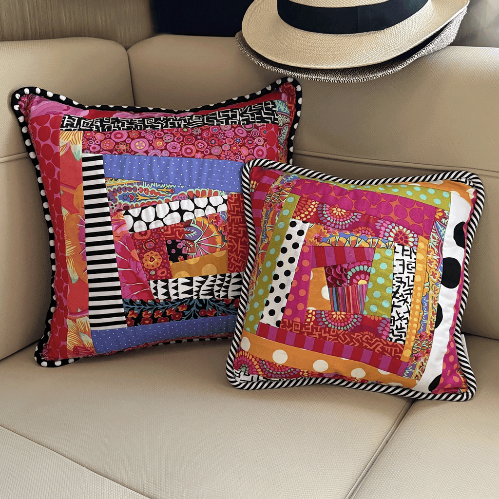 Handcrafted plump throw pillows bursting with bright reds and blues with a splash of black, white and other contrasting colors.